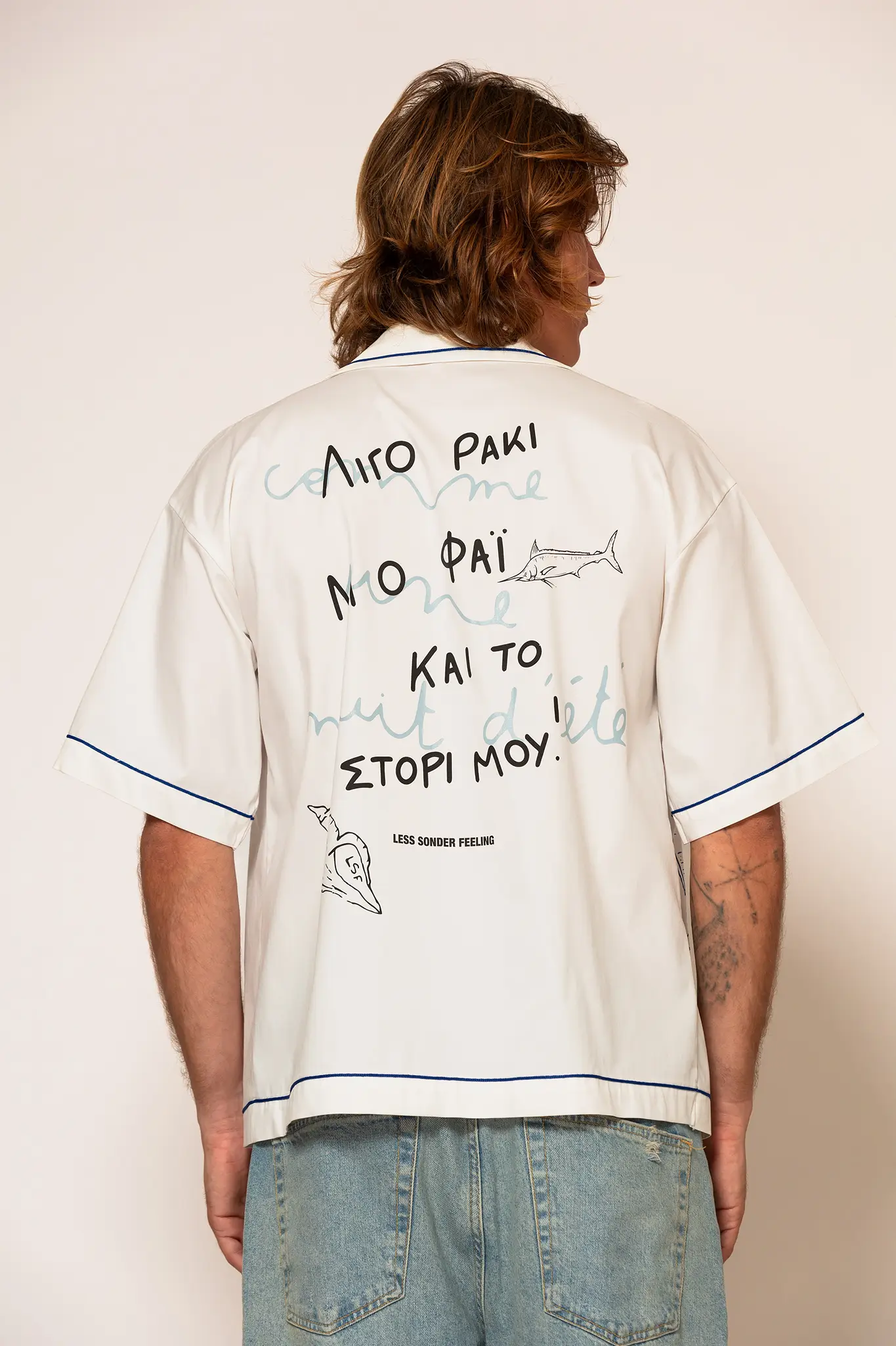 Oversized shirt crafted from cotton poplin. This piece is designed with a comfortable loose fit. The logo embroidery at front as the unique illustrations inspired for Greece summer transform it into a unique versatile and breathable garment that will accompany you on your serene coastal walks and upscale summer retreats.