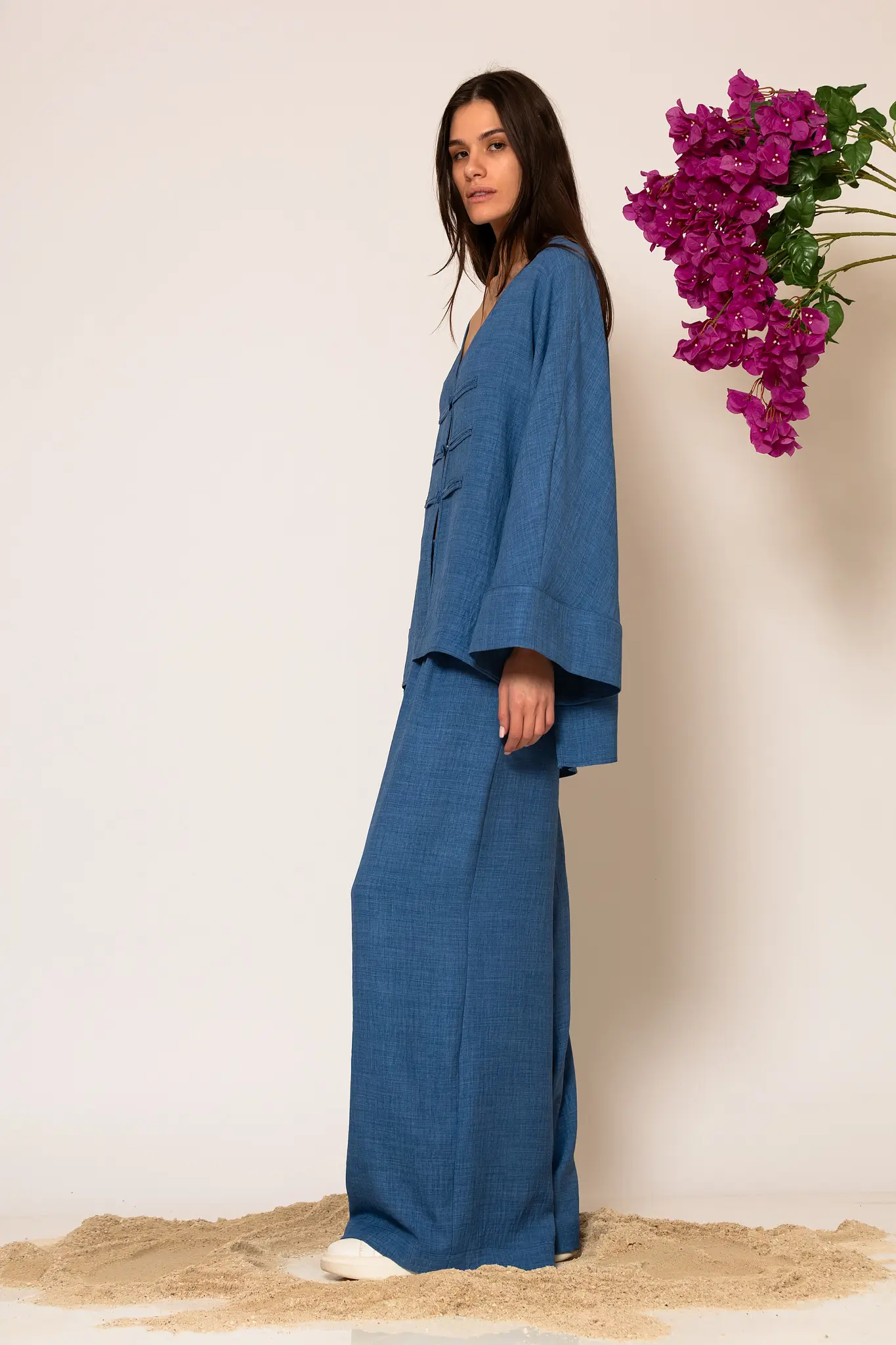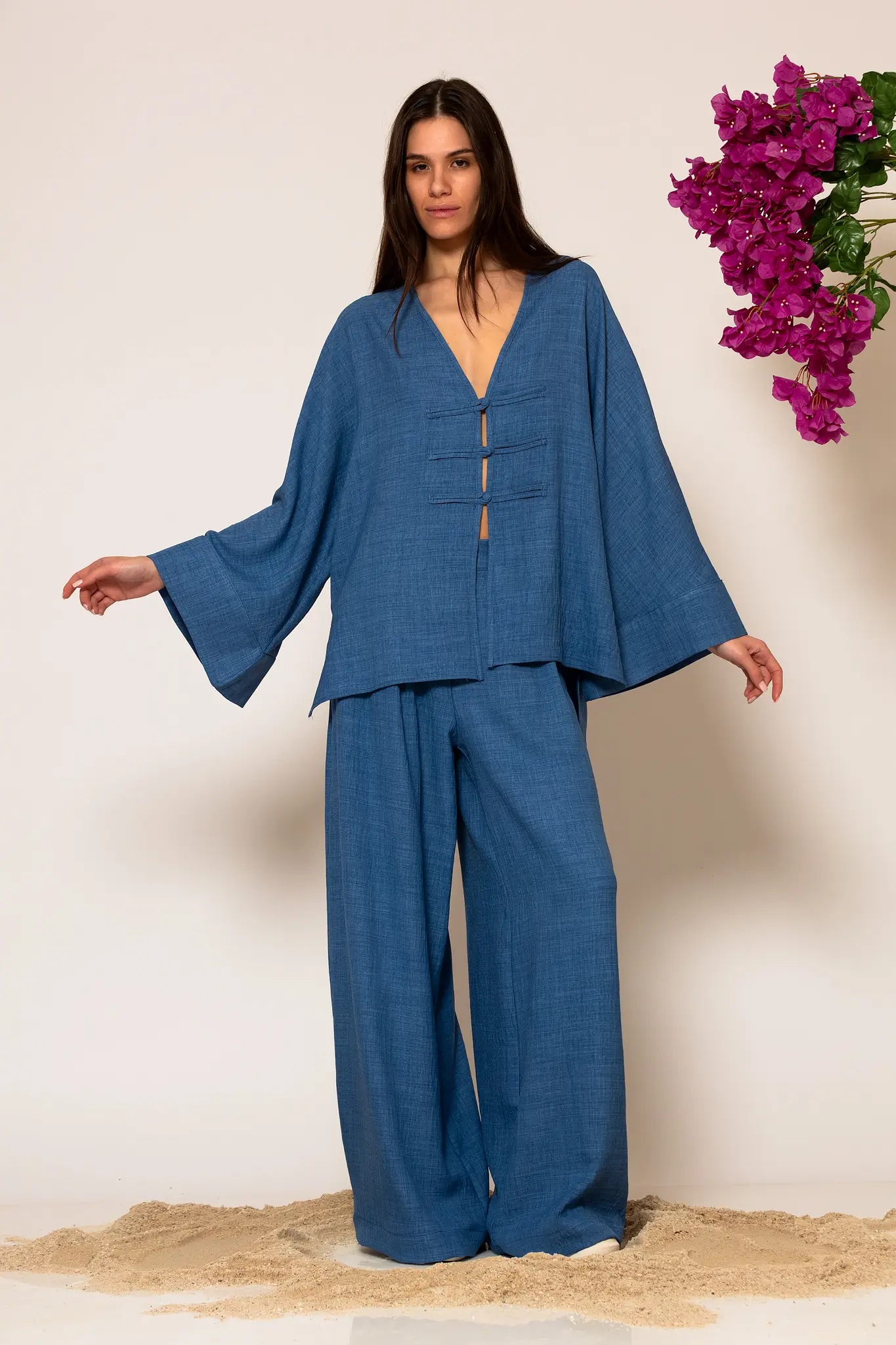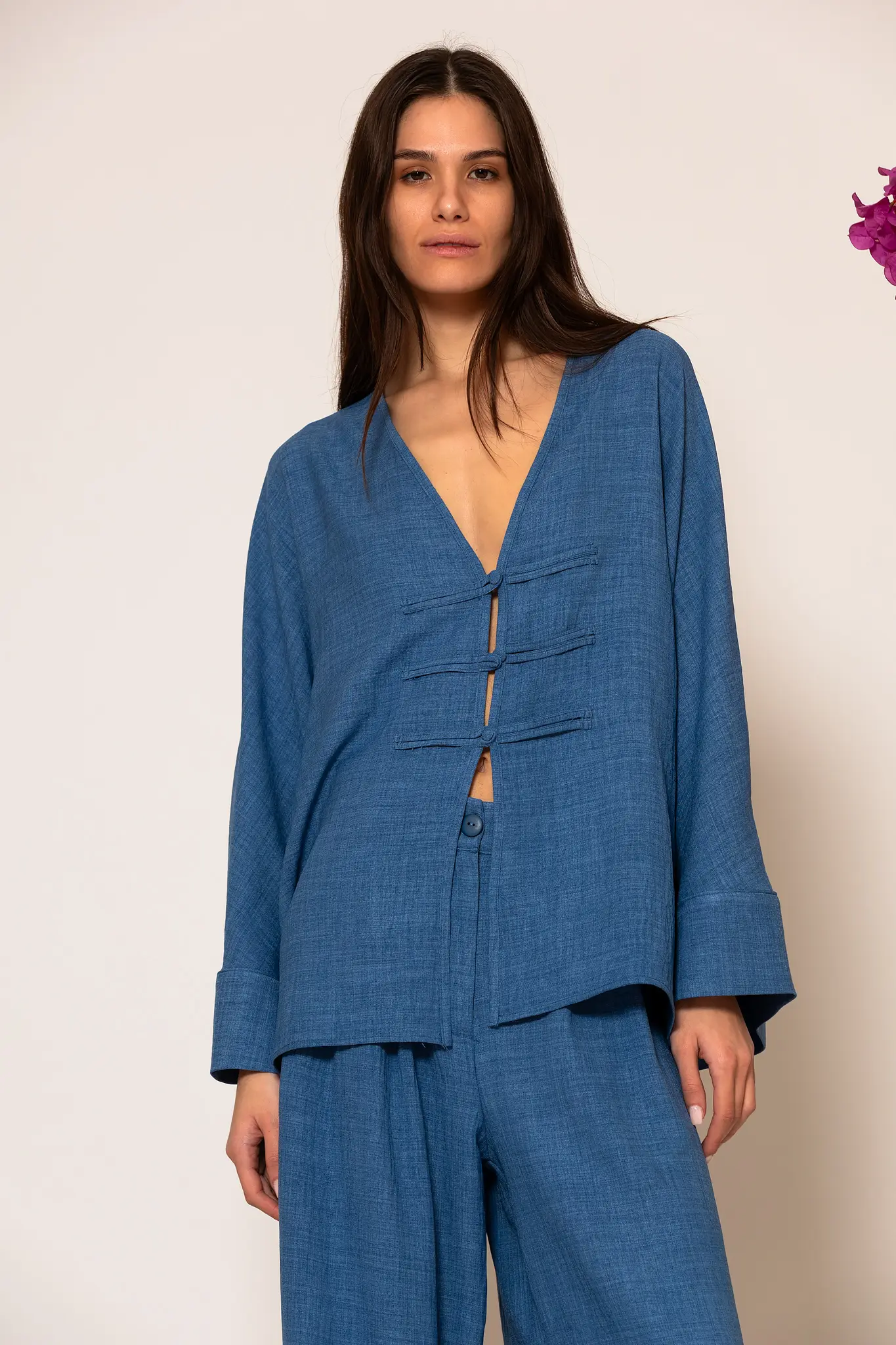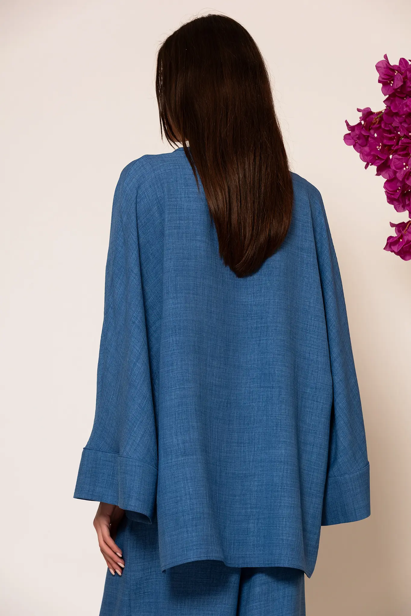 High-end Oversized shirt crafted from linen fabric. This piece is designed with a clean front finish with button closure and long wide sleeves. A versatile and breathable garment that will accompany you from day to night ensuring a flawless and sophisticated silhouette.