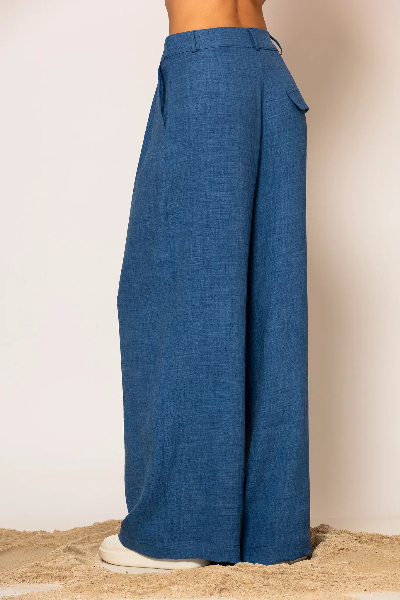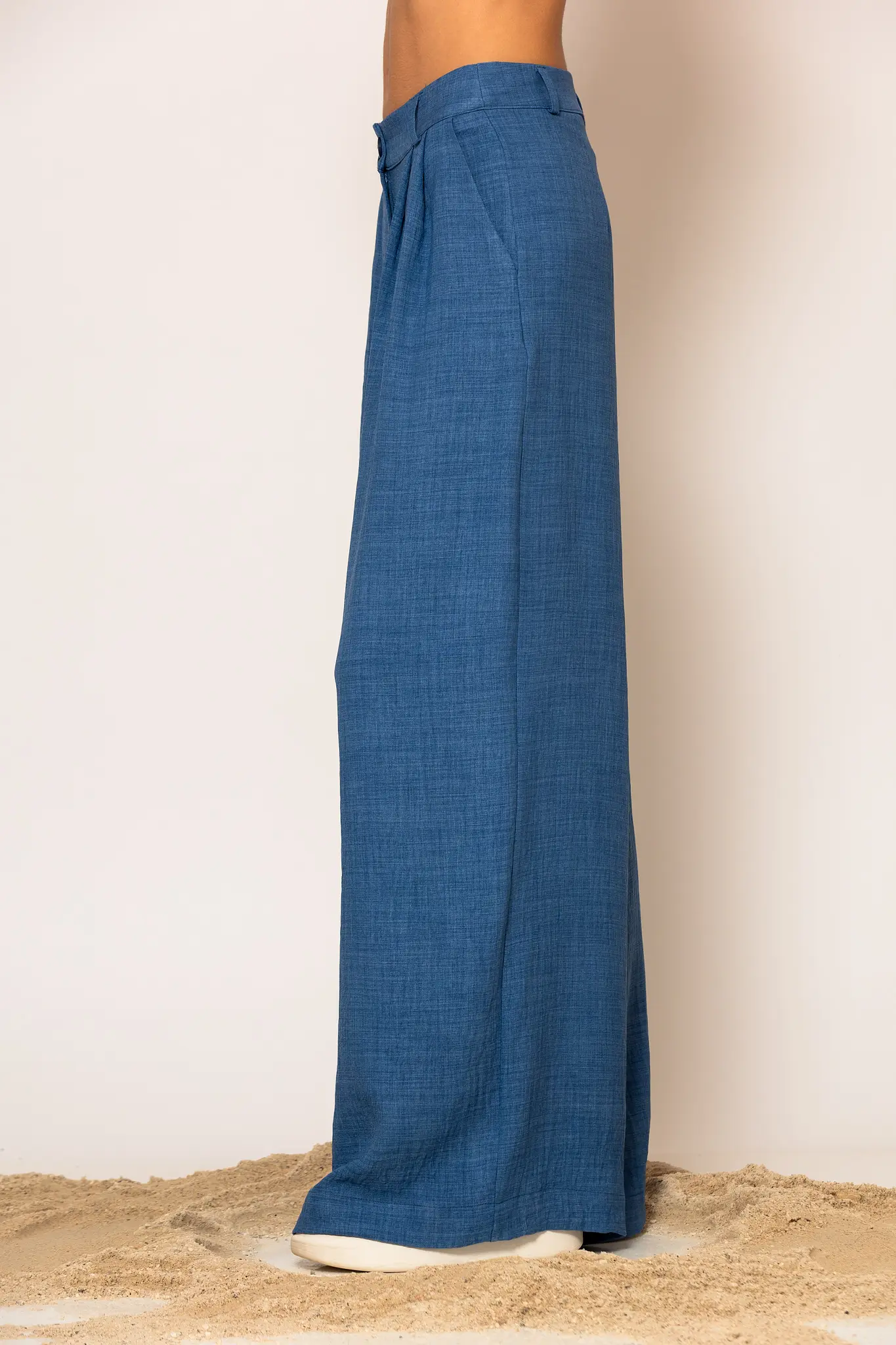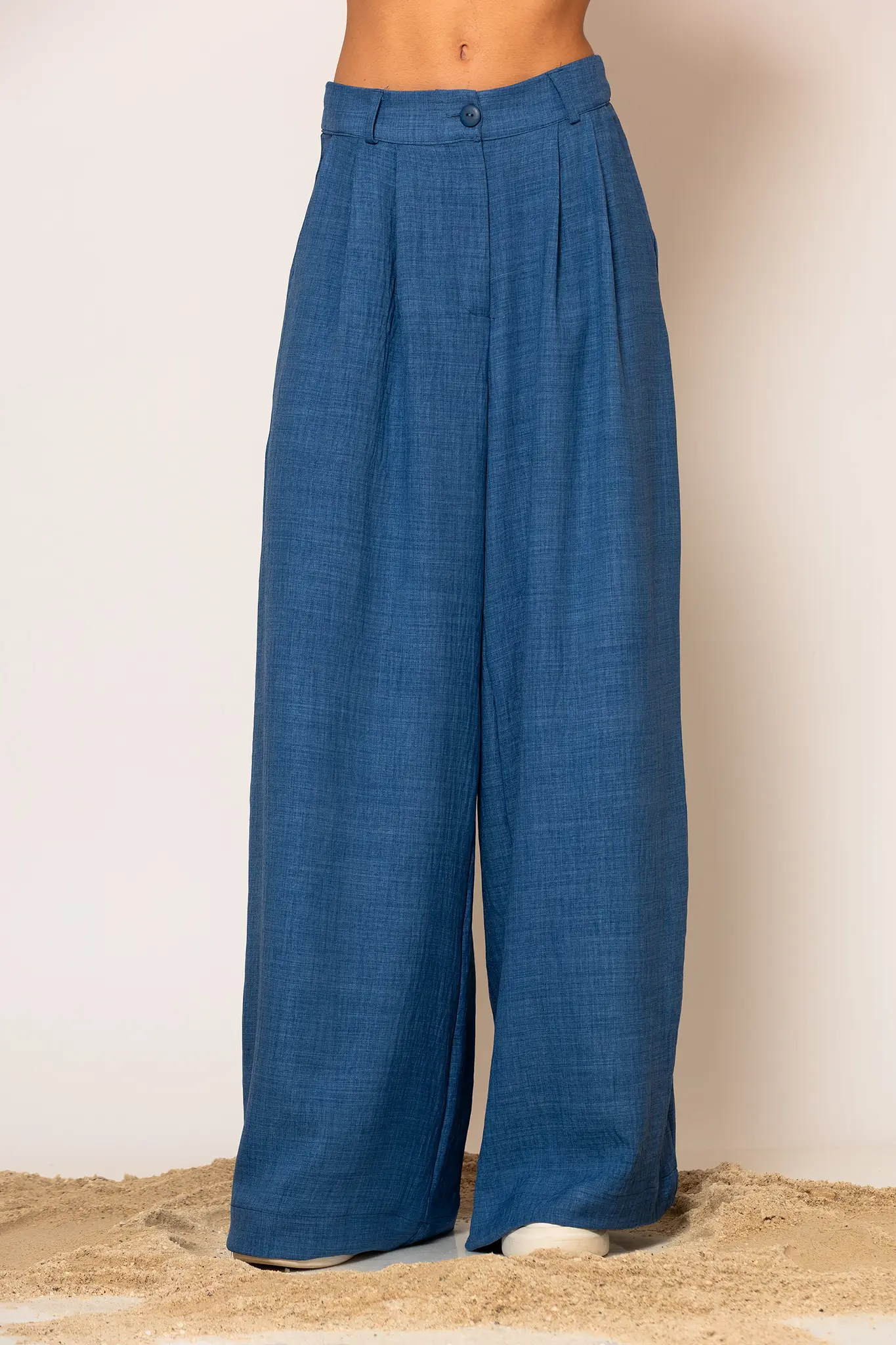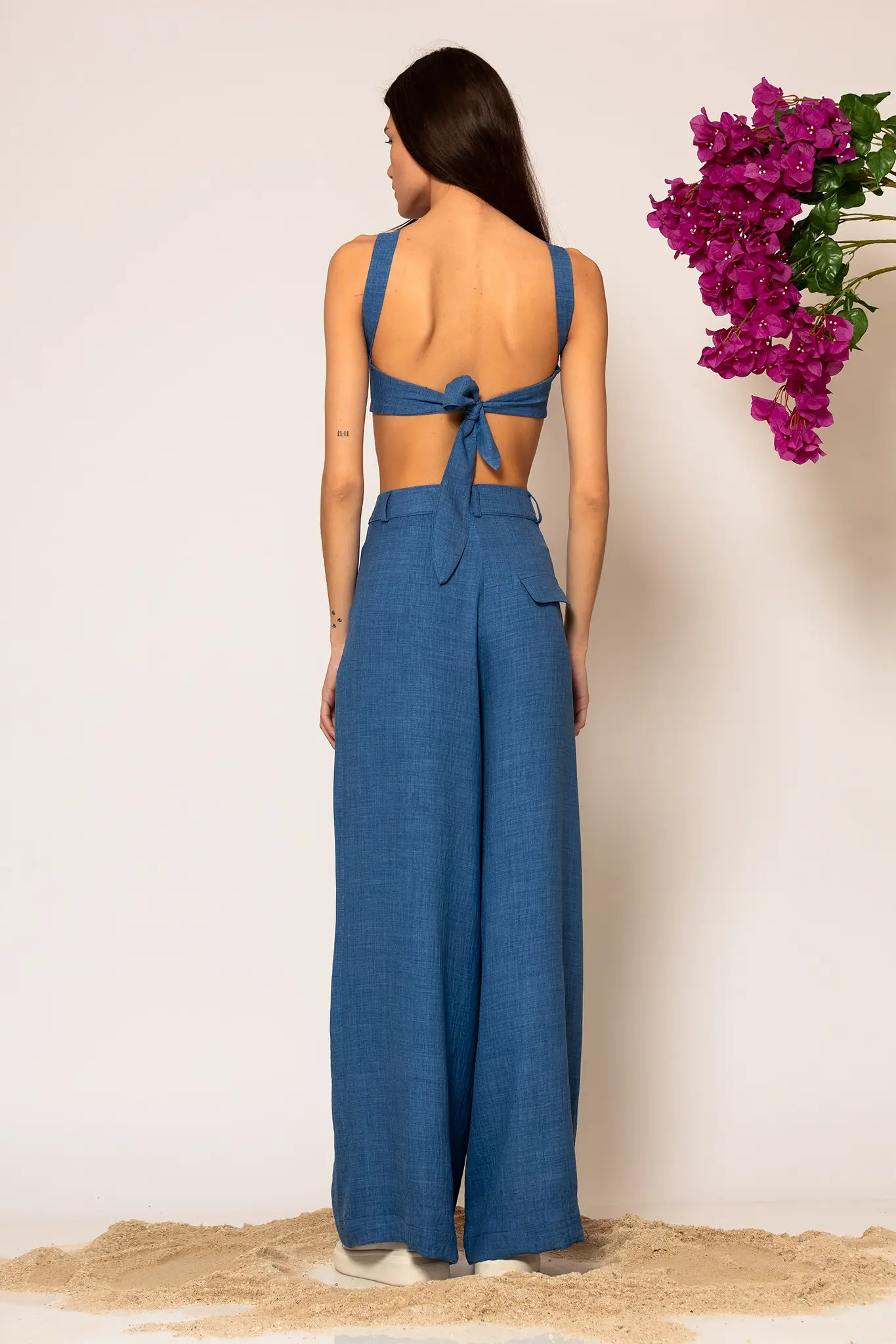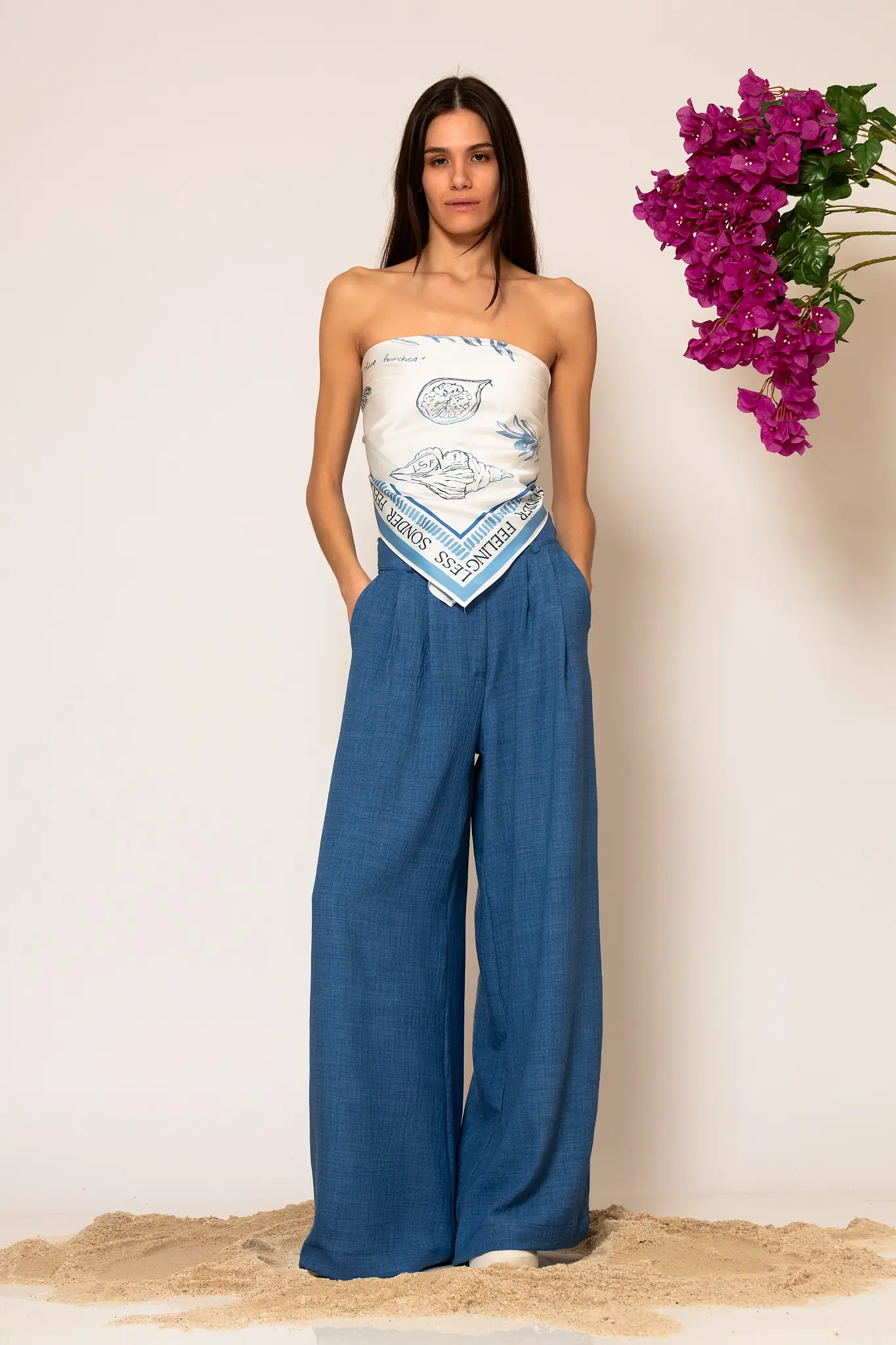 High-end wide-leg pants crafted from linen fabric. This piece is designed with a clean front finish with a button closure. A versatile and breathable garment that will accompany you from day to night ensuring a flawless and sophisticated silhouette.