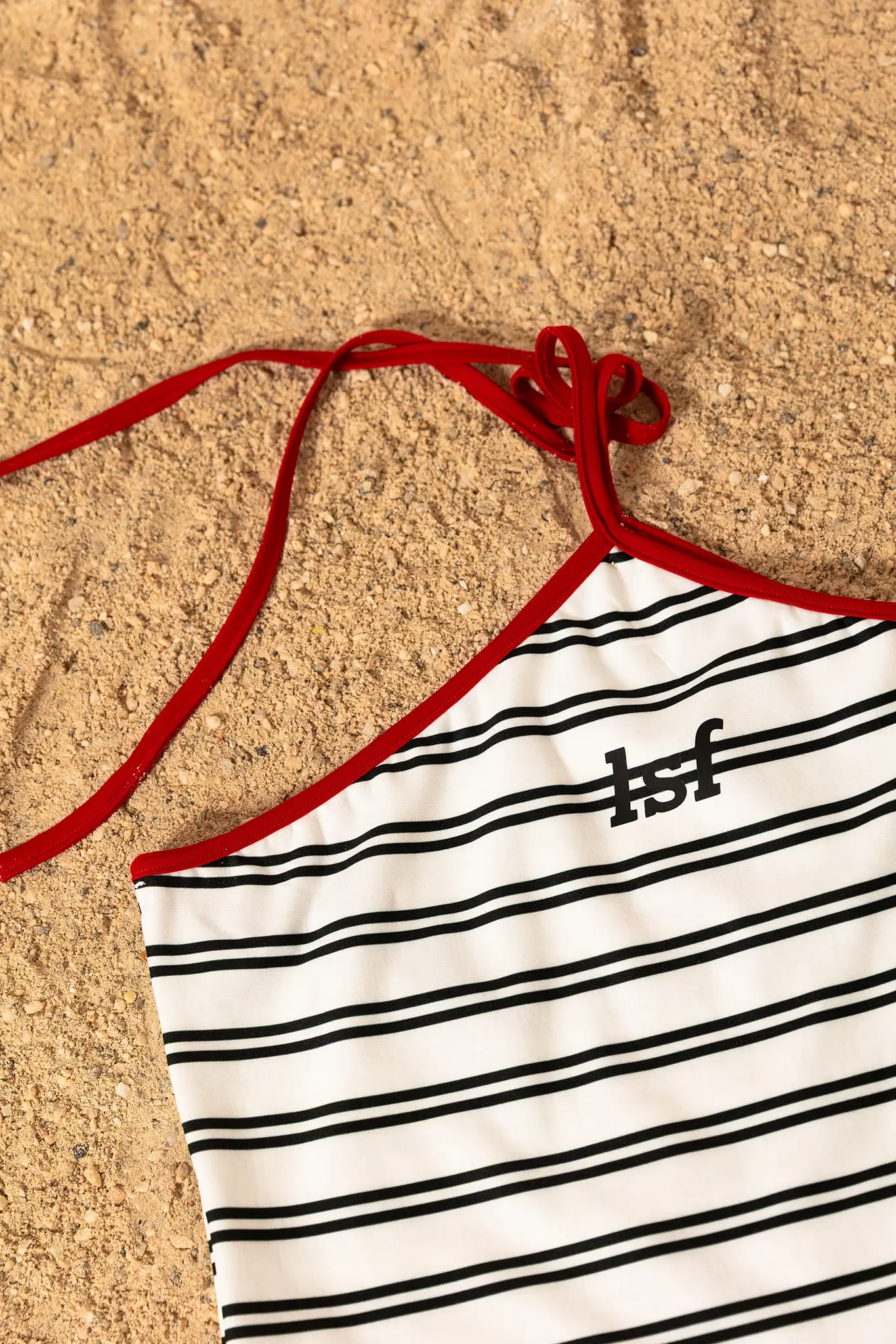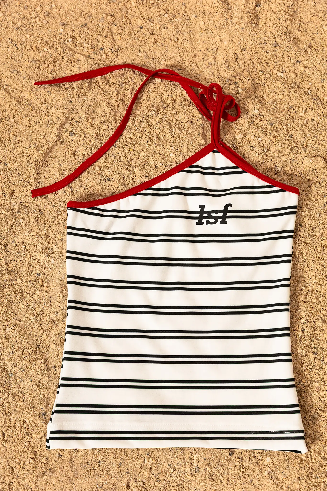 Αυτό το ριγέ τοπ με τύπωμα λογότυπου αποτελεί μια από τις πιο δυνατές τάσεις για την άνοιξη και το καλοκαίρι του 2026. Ο συνδυασμός του κλασικού ναυτικού μοτίβου με την ταυτότητα του brand δημιουργεί ένα look που ισορροπεί ανάμεσα στο διαχρονικό και το μοντέρνο.