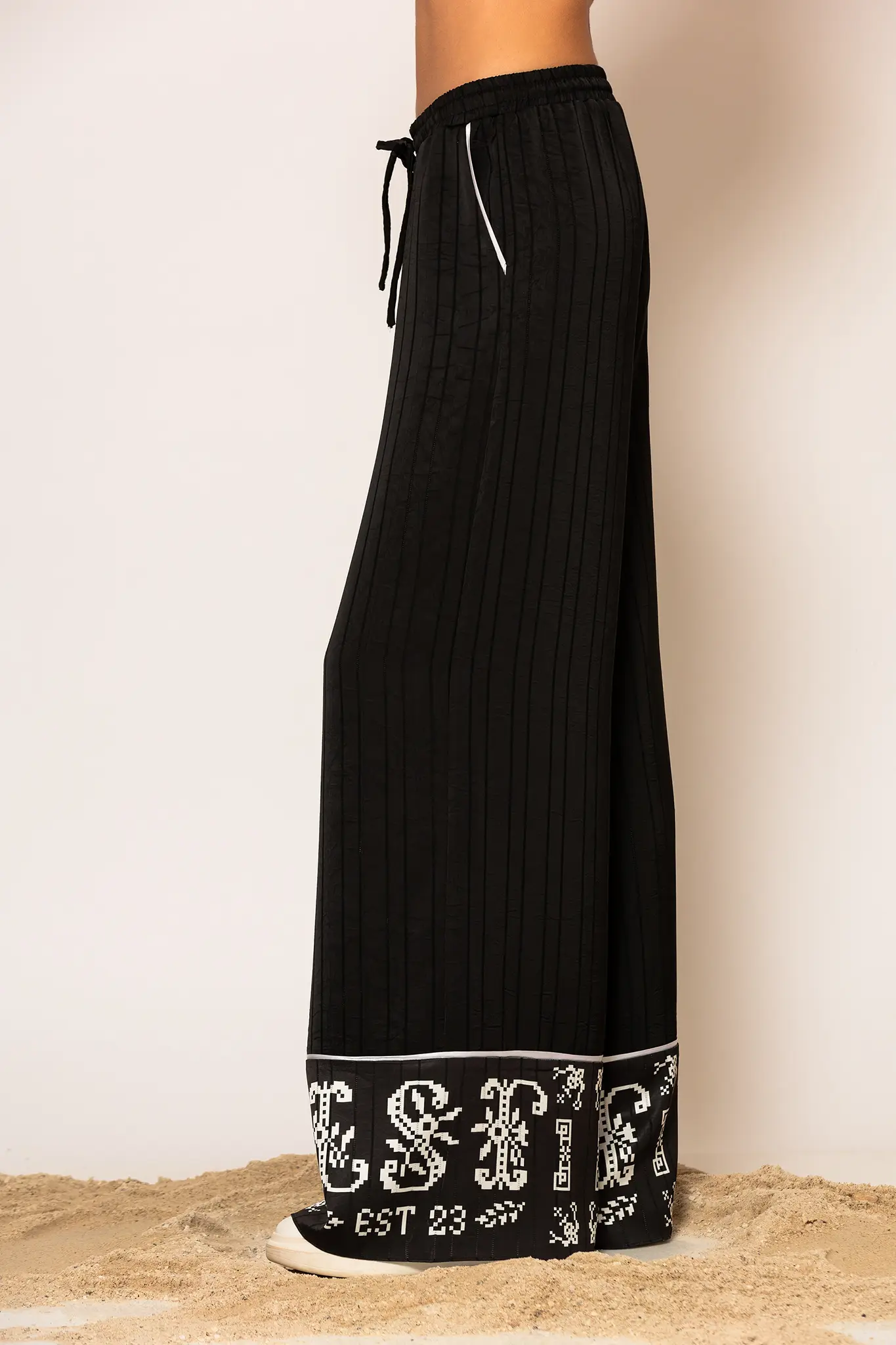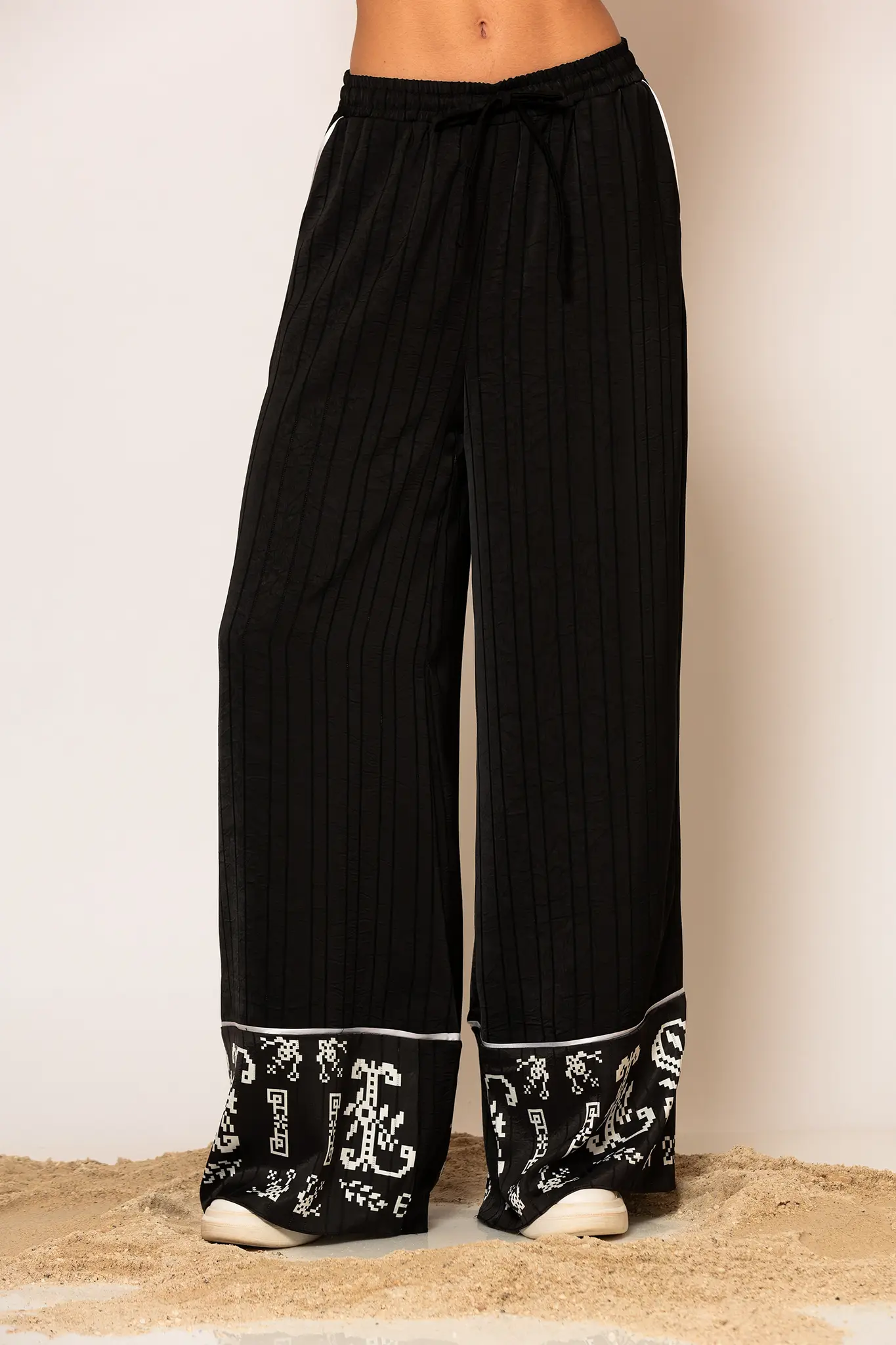 Experience the absolute luxury with these pants, crafted from premium satin striped fabric with contrast details and logo illustration print. Designed with a comfortable elasticated waistband and wide-leg silhouette, they offer effortless comfort and style.