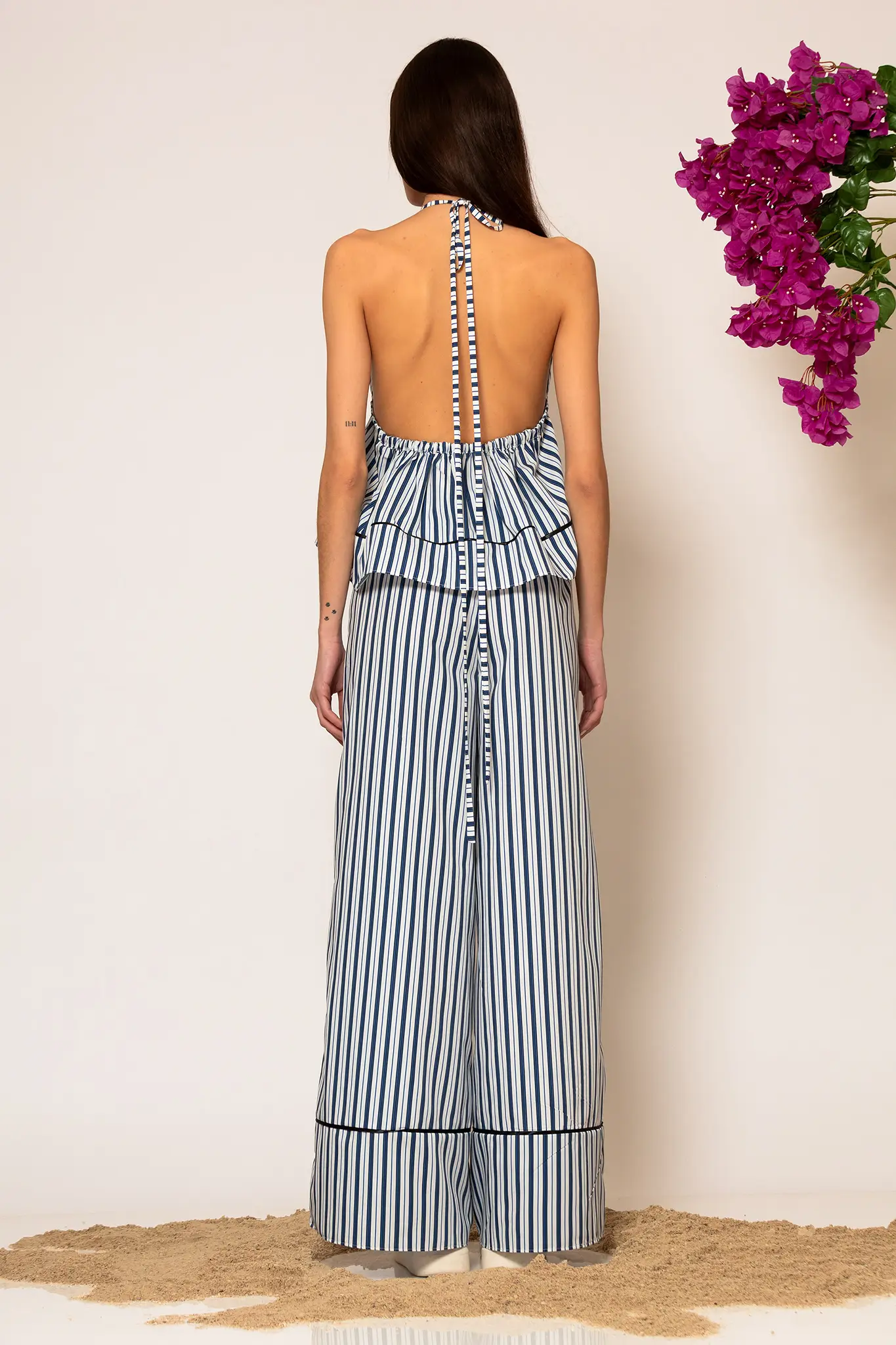 A high-end triangle top crafted from striped cotton blend poplin. This piece features halterneck fit with a subtle peplum silhouette. A romantic yet structural garment that will accompany you on your sunset dinner dates and exclusive resort evenings, offering a sophisticated and airy aesthetic.