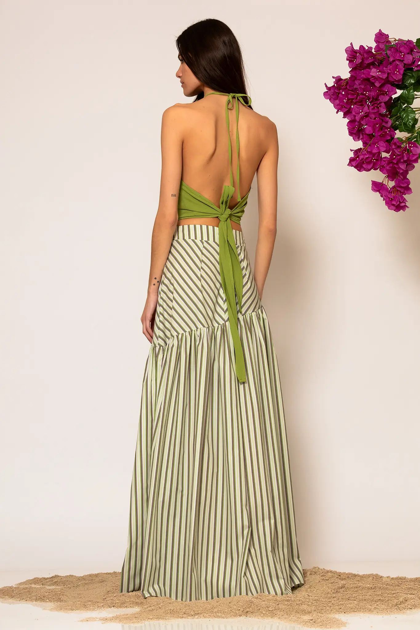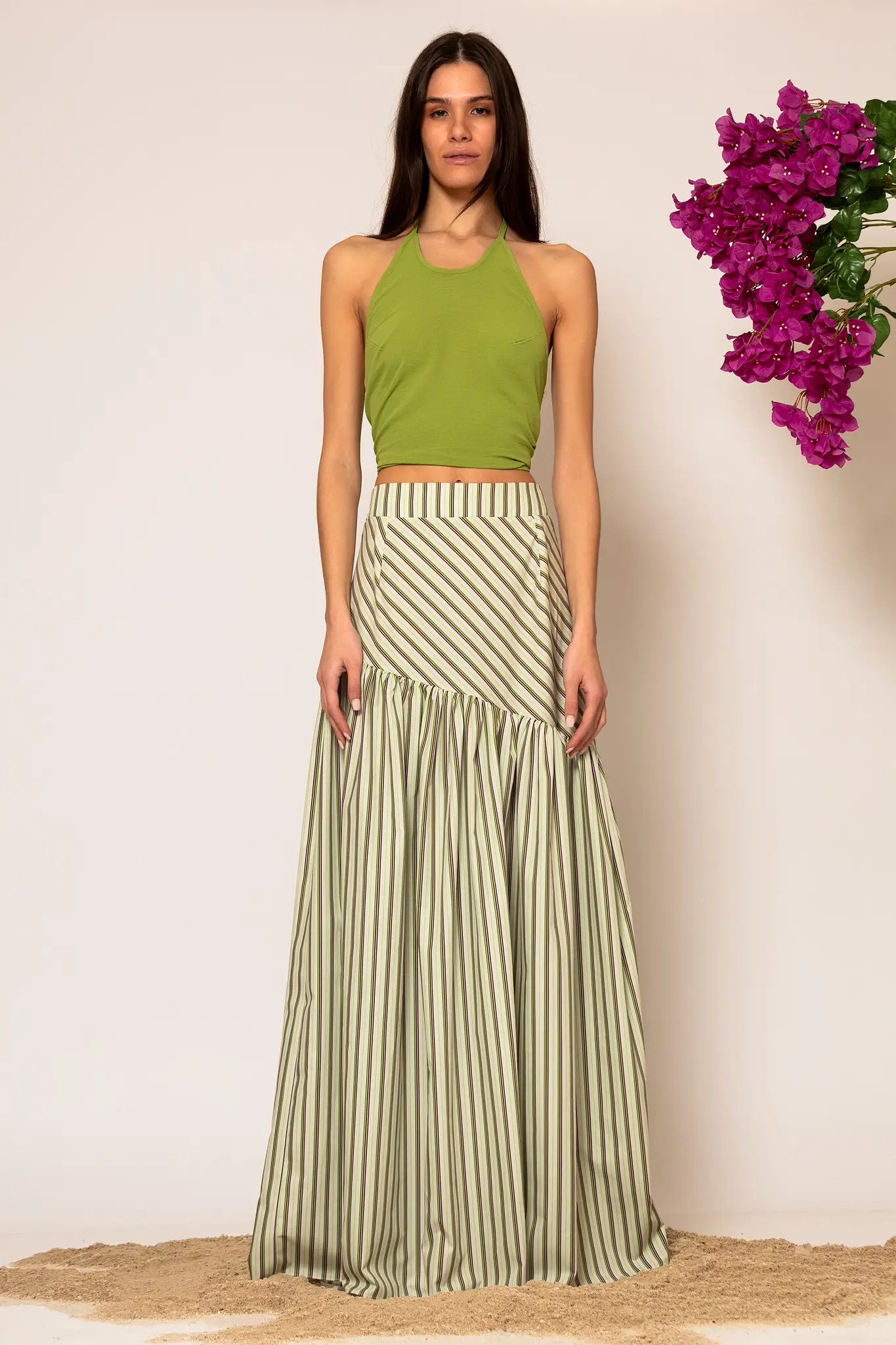 A high-end maxi skirt crafted from striped cotton blend poplin. This piece features a voluminous tiered silhouette with a tight fit at the waist and a clean back finish with a zip closure. A romantic yet structural garment that will accompany you on your sunset dinner dates and exclusive resort evenings, offering a sophisticated and airy aesthetic.