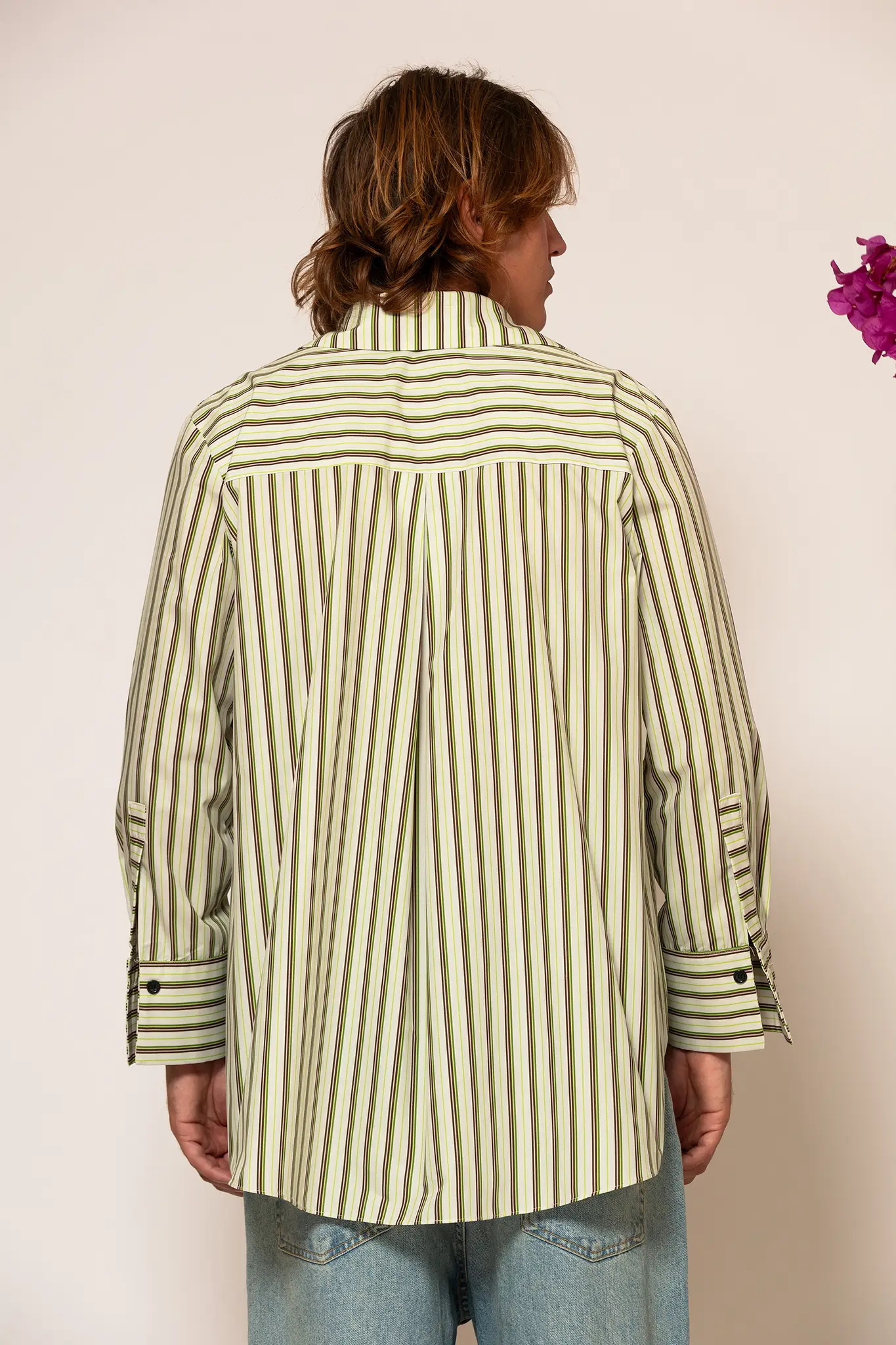 A high-end oversized shirt crafted from striped cotton blend poplin. This piece features a comfy loose fit with collar and logo print at cuffs . A garment that will accompany you all summer offering a sophisticated and airy aesthetic.