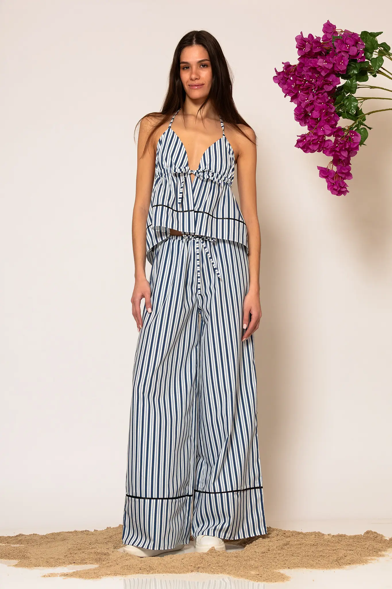 A high-end wide-leg pants crafted from striped cotton blend poplin. This piece features a wide-leg comfy silhouette with a drawstring waist. A garment that will accompany you all summer offering a sophisticated and airy aesthetic.