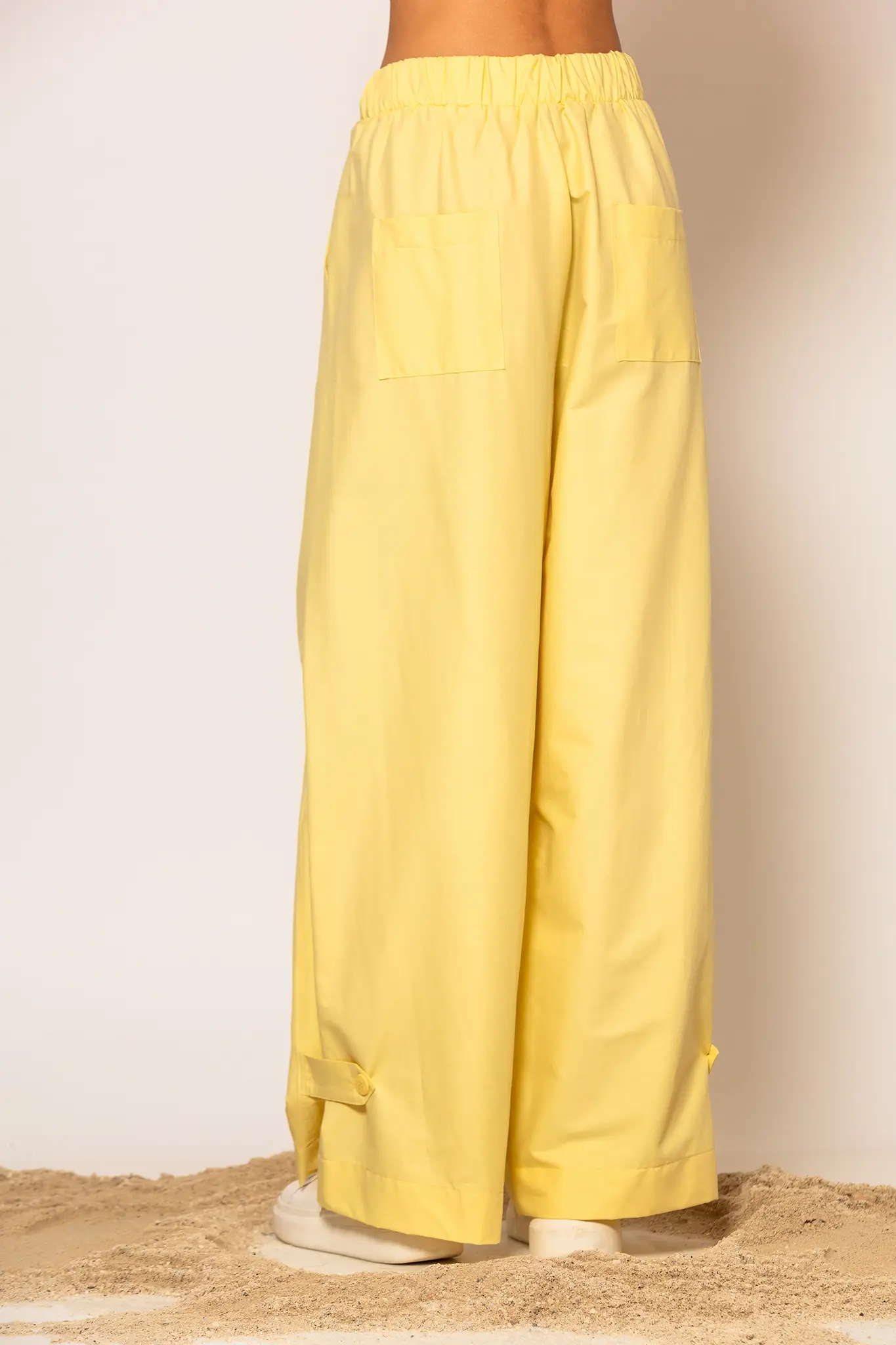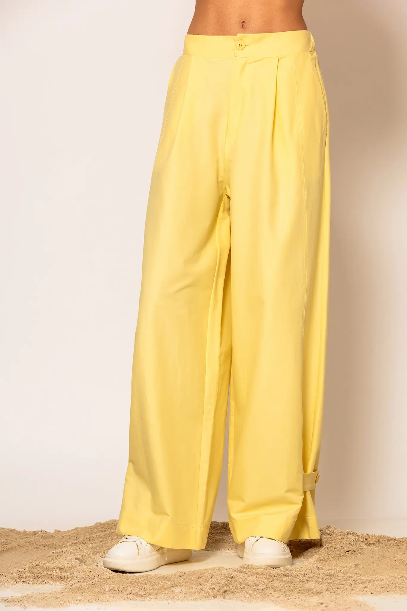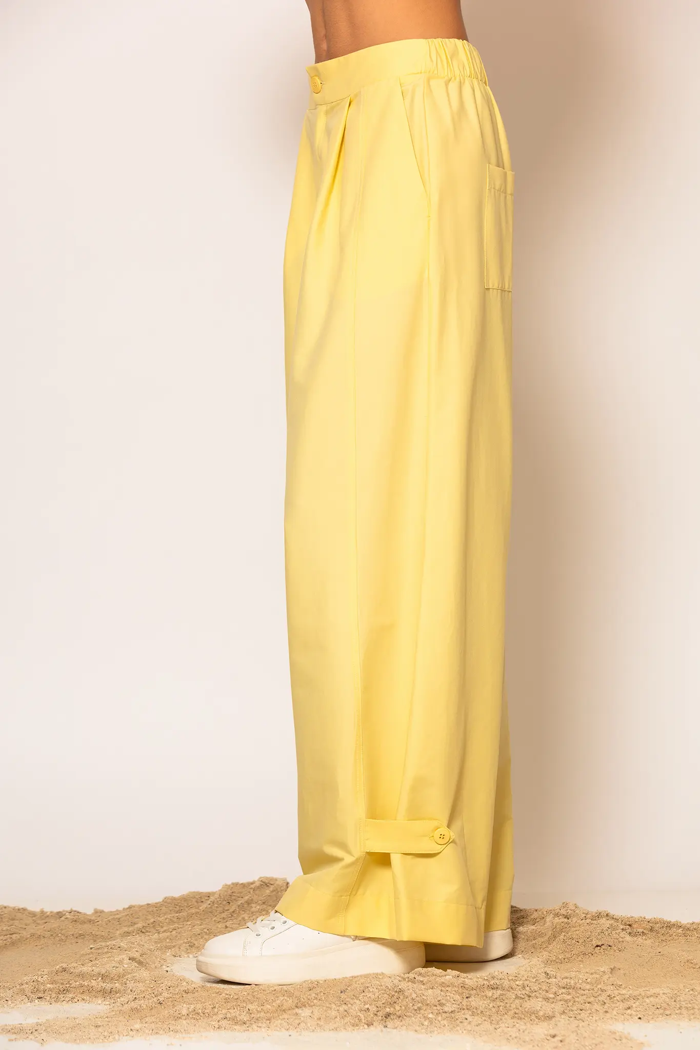High-end wide-leg pants crafted from cotton poplin. This piece is designed with a comfortable elasticated waistband at the back and a clean front finish with a button closure. A versatile and breathable garment that will accompany you on your serene coastal walks and upscale summer retreats, ensuring a flawless and sophisticated silhouette.